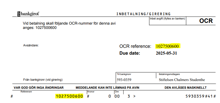 ange OCR-nummer vid betalning.